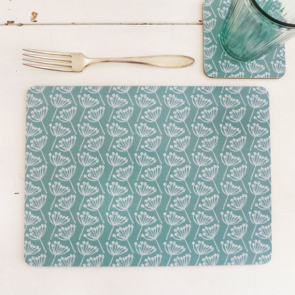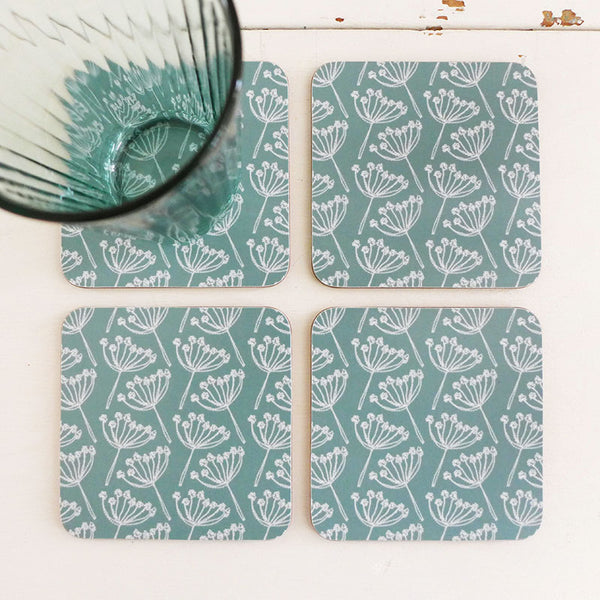 A set of 3 melamine Cow Parsley coasters in sea green, decorated with Charlotte's embroidered floral illustrations, inspired by the countryside blooming with cow parsley in summertime.