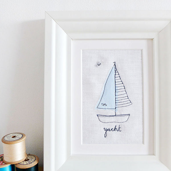 The yacht features one stripy embroidered sail and one appliquéd blue patterned sail made from a piece of envelope lining, with a seagull soaring up above.