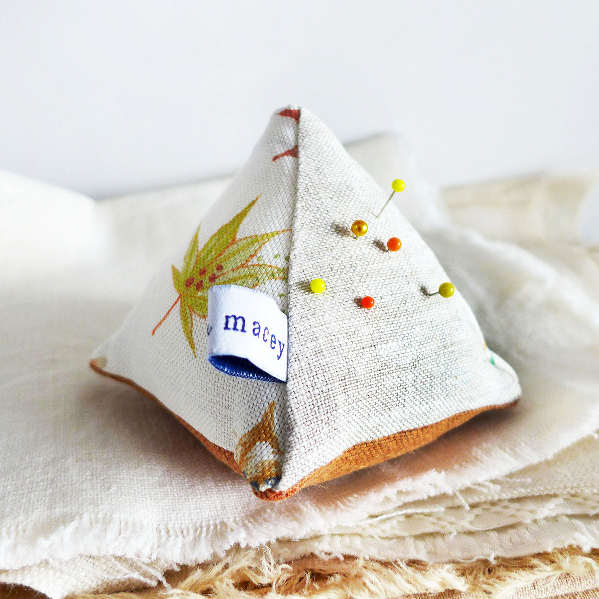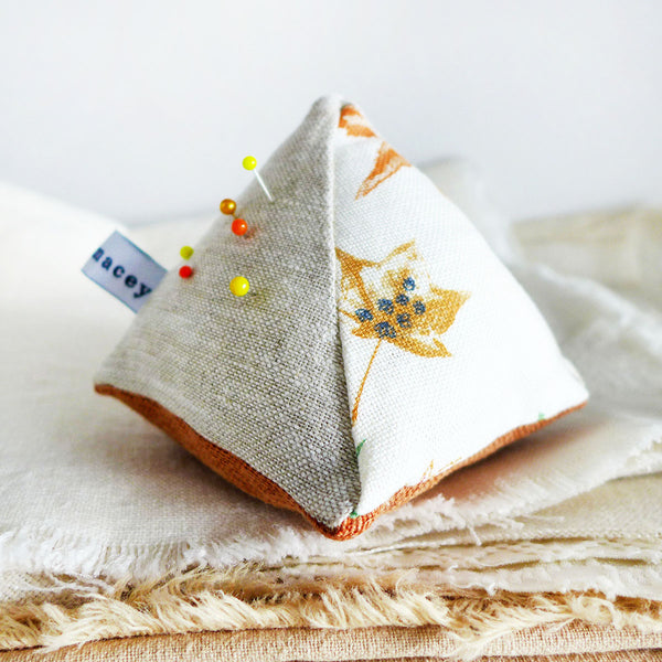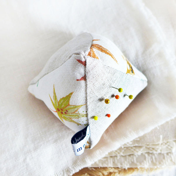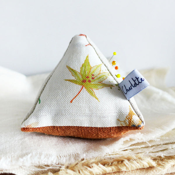 A handy linen pin cushion made from Charlotte's Leaf Flurry print, perfect to have by your side throughout all your stitching adventures.