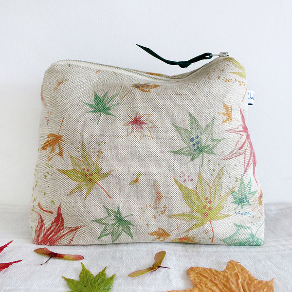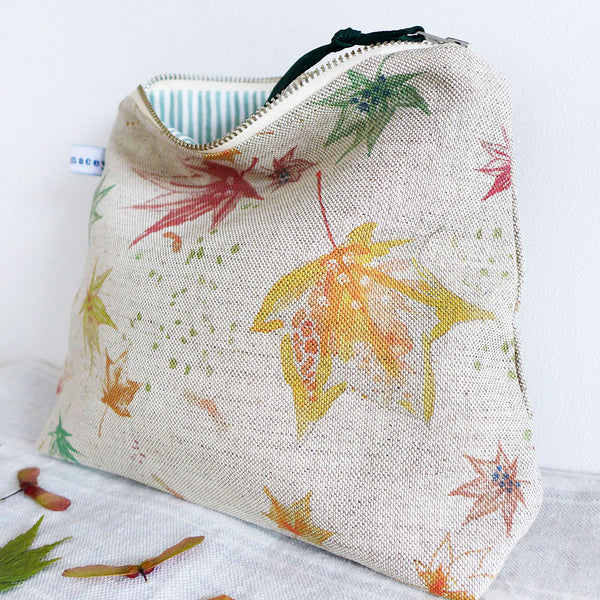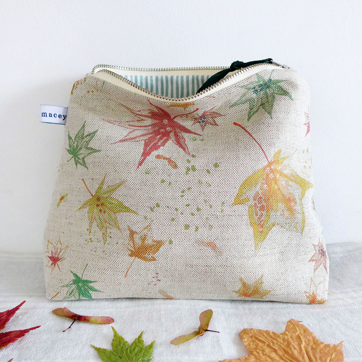 A versatile Leaf Flurry print tall pouch that makes an ideal yarn bag, or for everything else including carrying make-up or storing your favourite bits and pieces.